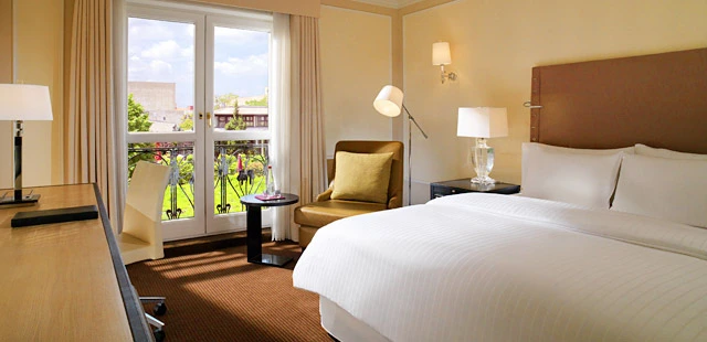 "Luxury accommodation in an historic spot, at the corner of Friedrichstraße and Unter den Linden, offering large, elegant rooms and US-style service."