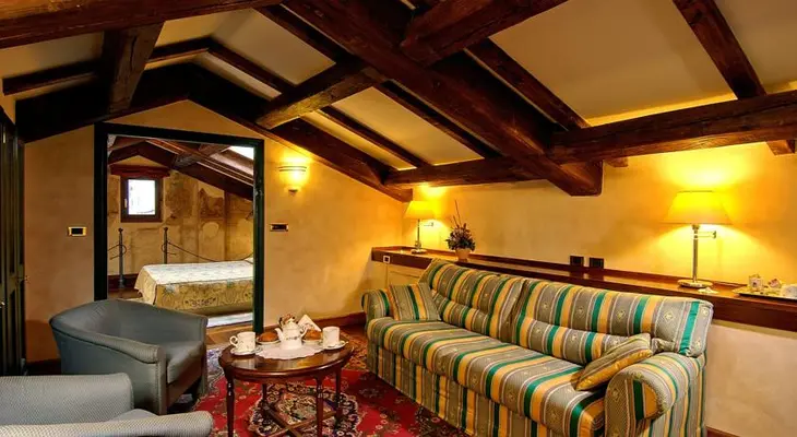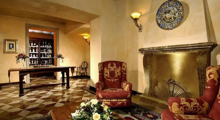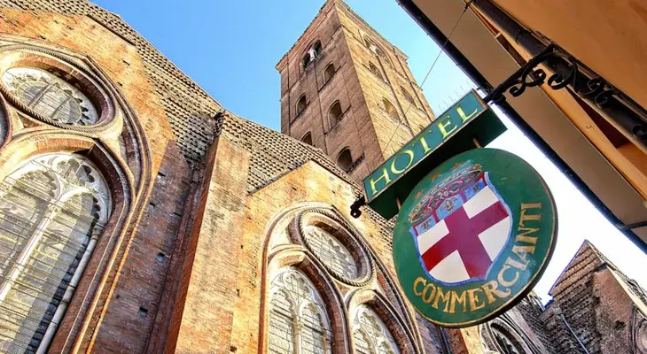 "In the heart of the city, just off Piazza Maggiore, this historic building dates from the 12th century. Delightful bedrooms and suites, some with wooden beams or frescoes."