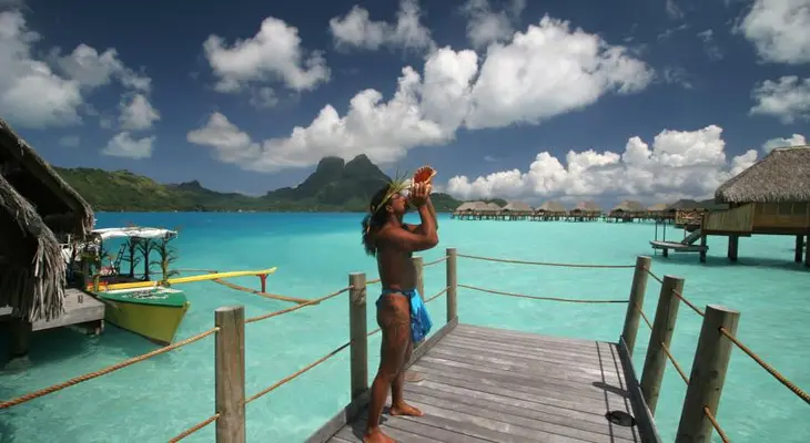 "108-room property Le Bora Bora, wooden walkways studded with thatched overwater bungalows...the resort is built on Bora Bora’s barrier reef."
