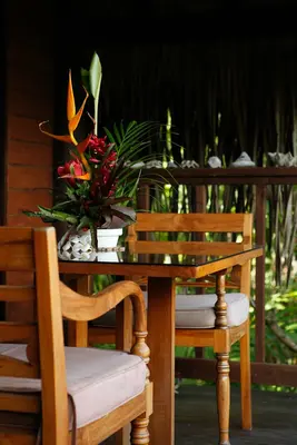“This upscale venture is a more intimate alternative to a resort, with three all-wood, fully equipped bungalows cocooned in exotic gardens on the mountainside overlooking Povai Bay.”