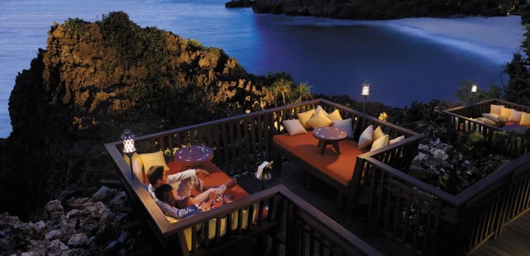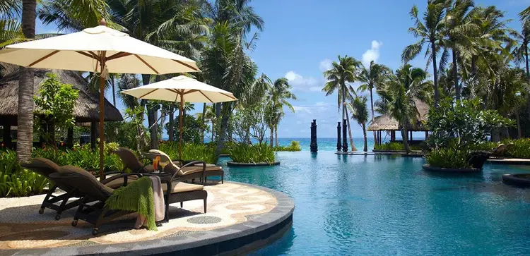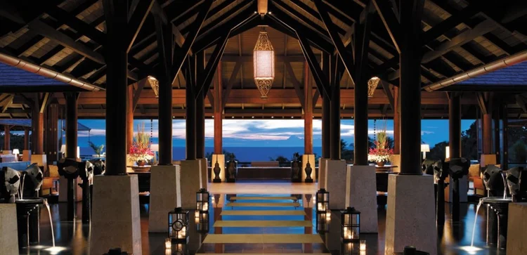 "Perched above its own private beach, the Shangri-La presents a range of attractively styled rooms and villas which blend comfortably into the lush hills."