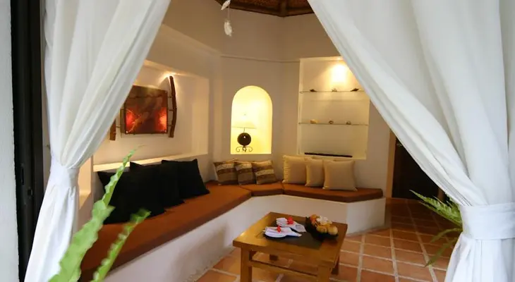 “The standard cottages have seen better days here, but the deluxe models have fully tiled marble bathrooms, curved surfaces, inviting linens, and large and well-furnished verandahs.”