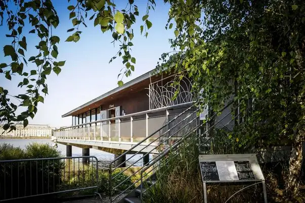 “Set on the Right Bank, opposite the main town, this trendy restaurant (quirkily set on stilts over the water) offers you a glimpse of what sailors must have seen when they first cruised up the estuary.”