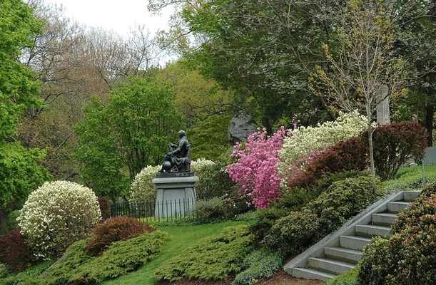 "America's first landscape-designed cemetery, good for birdwatching."