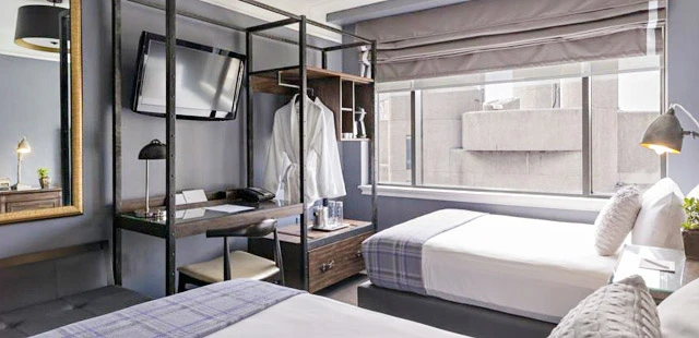 "The guest rooms strike a balance between cool earth tones and curious metalwork...distinctive accommodations abound — in the Boxer Bunk rooms, twin beds stretch above full size mattresses." Full review