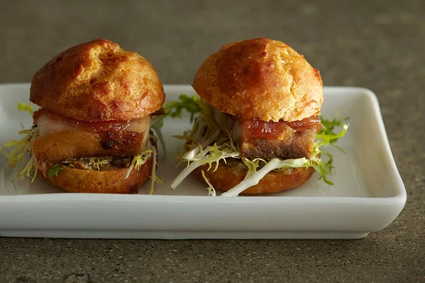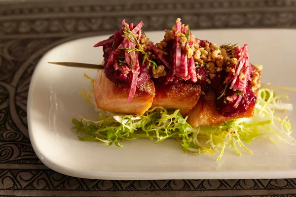 “Also exquisite are the pesto-laden kohlrabit fritters, the mussel-stuffed heirloom tomatoes, the honey-braised lamb and the Tunisian steak tartare.”