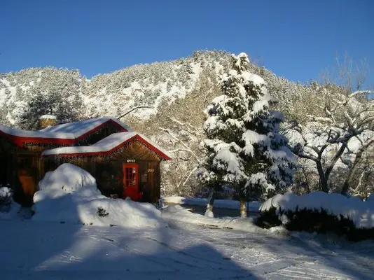 "The motel itself looks like a cabin has been stretched out and bent around a parking lot, then tucked into a wooded glen literally at the foot of Flagstaff Mountain." Full review