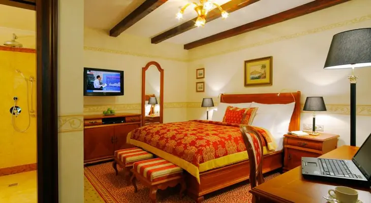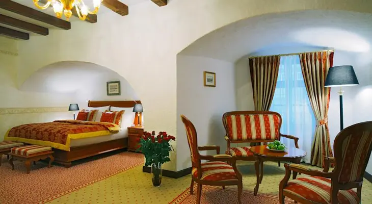 “ The rooms continue the lush, romantic vibe with red and gold silk fabric, oversized marble bathrooms, and working fireplaces.”