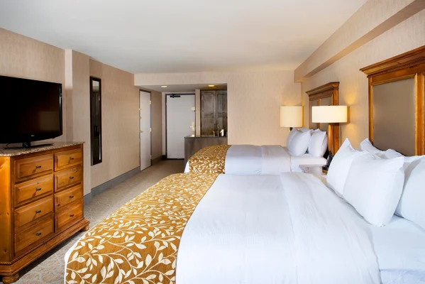 “The DoubleTree by Hilton Breckenridge is a three-and-a-half pearl chain hotel with alpine ski lodge style that's a five-minute walk from multiple Peak Nine chair lifts at Breckenridge Ski Resort.”