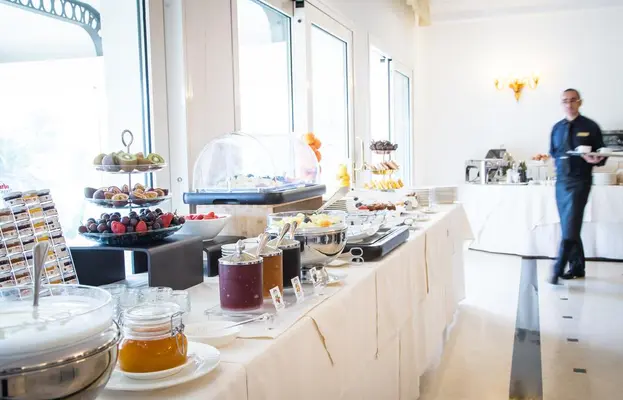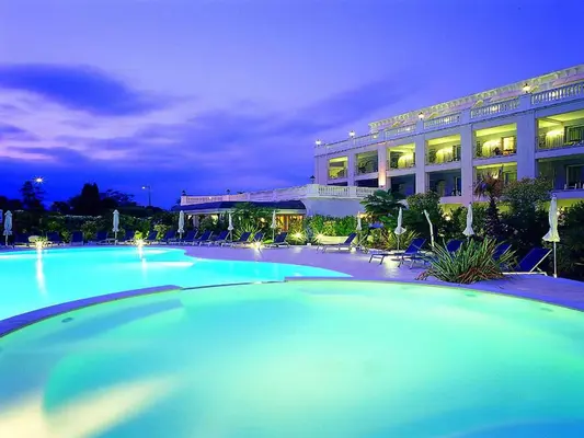“Bordering Lake Garda, and offering beautiful views of it, the Palace Hotel is an upper-middle-range property, calmly set between the towns of Desenzano del Garde and Sirmione.”