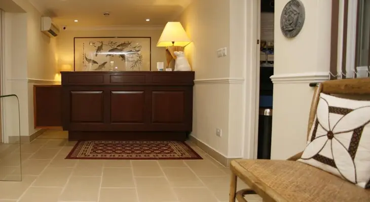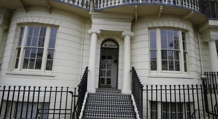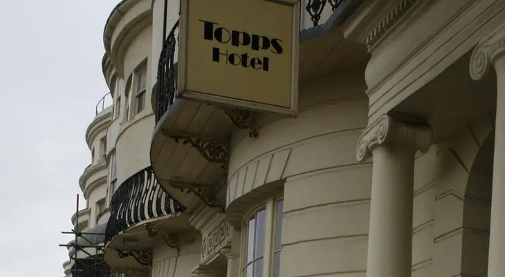 “This cream-colored hotel enjoys a diagonal view of the sea from its position beside the sloping lawn of Regency Square, a half-block from the sea.”