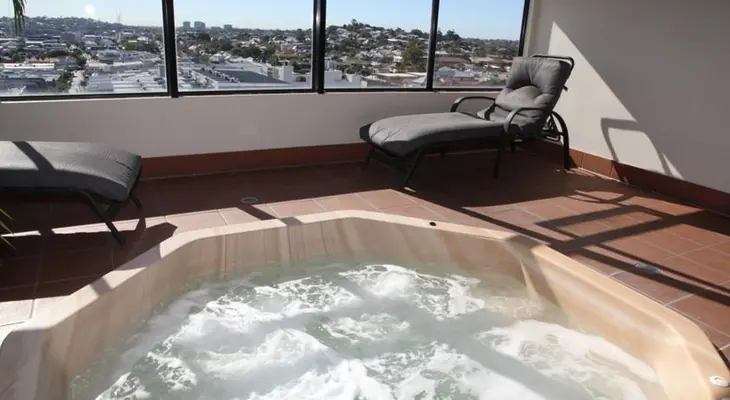 "Sparkling apartment hotel offering unfussy, modern accommodation. Shared amenities include seventh-floor heated spa, BBQ area, sauna and gym. $145."