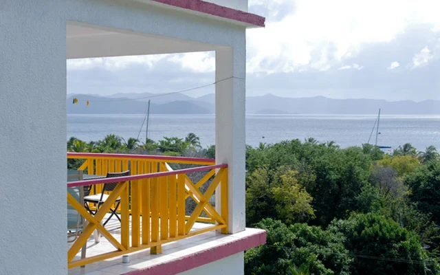 "Set on a steep hill back from the beach. The three one-bedroom suites each have a full kitchen and private porch with ocean views. There are also a couple of larger cottages on-site." Full review