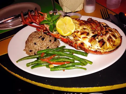 Food choices include steamed and grilled fish, fish filets, and West Indian stews of pork, mutton, goat, or chicken. Limeade and mauby are available, but many stick to rum or beer. — Frommer's