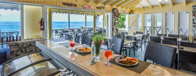 At this waterfront spot, tables are arranged along a terrace facing a small marina and the harbor in Road Town. — Fodor's