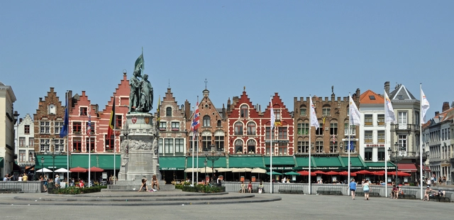 “The heart of ancient Bruges, the old market square is lined with pavement cafes beneath step-gabled facades.”