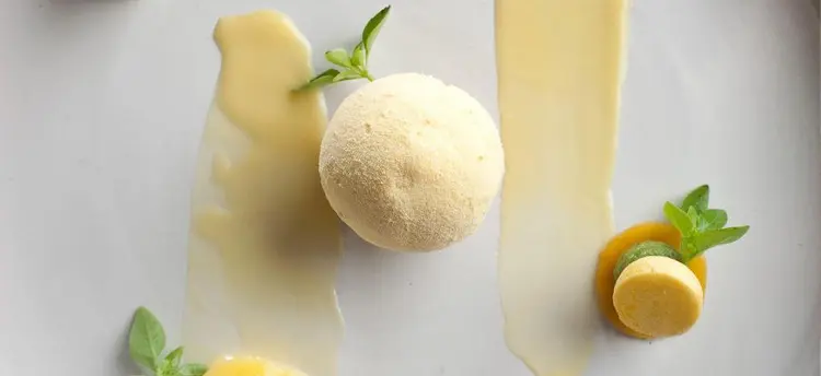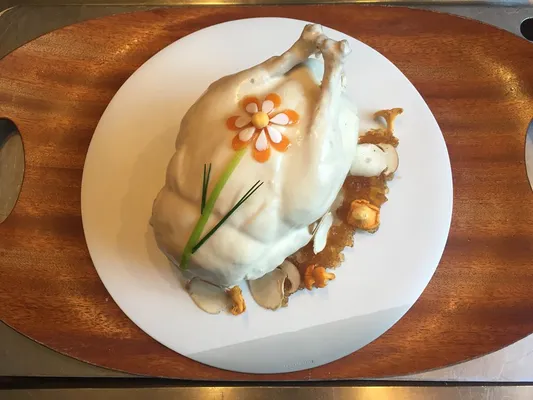 “Bare brick walls, a modernistic fireplace and striking contemporary modern ceramics form a stage for this open-kitchened ‘cooking theatre’ that prides itself on its gastronomic French cuisine and fresh ingredients.”