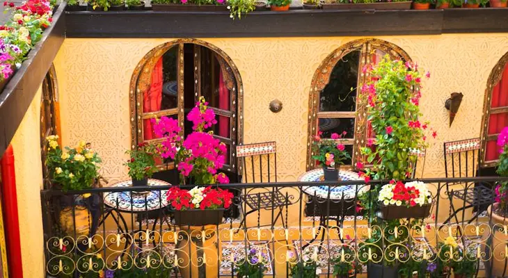 “Salmon-colored walls, plants, and old paintings create a warm, intimate ambience that's carried into the rooms.”