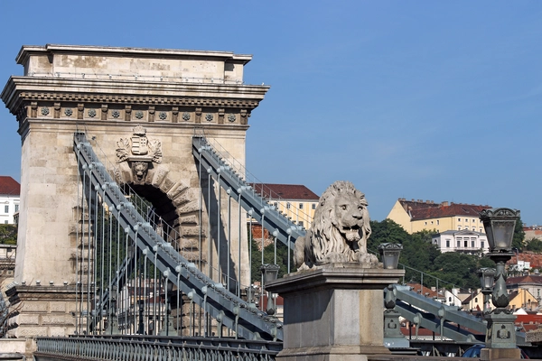 “Széchenyi Bridge, or the Chain Bridge, is the oldest in the city... and is magnificently lit at night. Two stone lions on pedestals keep proud watch over either end of the bridge.”