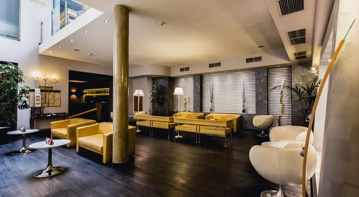 "In contrast, the lobby area is marked by marble columns, a green and orange marble floor, and a lounge area in the rear with yellow leather couches. The bar is in a beautiful modern ellipse." Full review