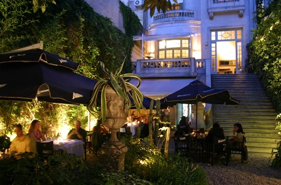 "Huge plants sprout from urns, ferns cascade, a fountain tinkles and standing fans turn idly at this romantic courtyard nook in Recoleta"