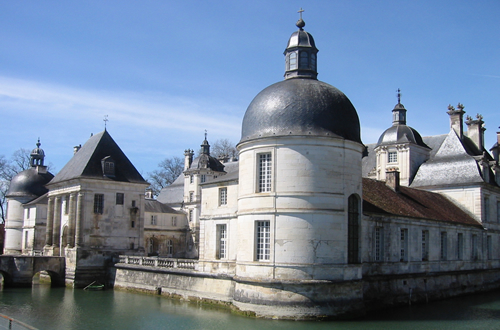 “The French Renaissance-style Château de Tanlay, an elegant product of the 17th century, is surrounded by a wide moat and elaborately carved outbuildings.”