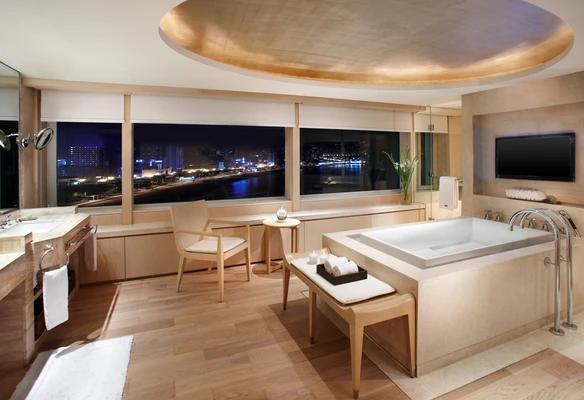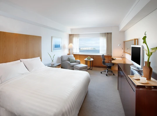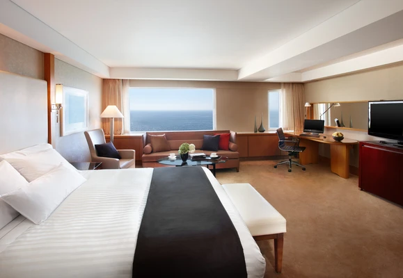 "Situated at the western end of Haeundae Beach with the hills of Dongbaek spread out to the rear. The lobby has wood and leather decor and modern frescos, and the rooms are tasteful."