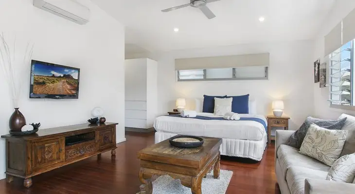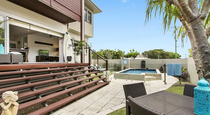 “This BKH-designed luxury villa on the north coast of New South Wales attracts celebrities, surfers, and “discerning Bohemians” to its four bedrooms, floating kitchen, private deck, and wet-edge pool.”