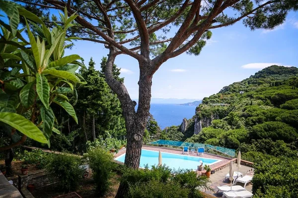 “Laidback retreat Villa Carolina is perched high on a forested hillside with unobstructed views of the Gulf of Naples and Mount Tiberio.”