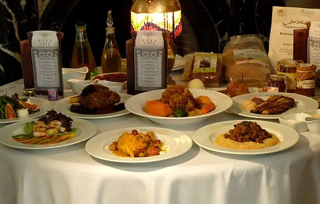 “Lunch offerings include Moroccan standards such as lamb tagine, as well as chili con carne and even a good old-fashioned hamburger. A separate dinner menu is printed daily.”