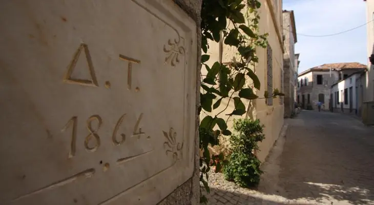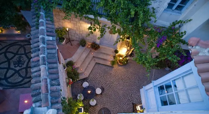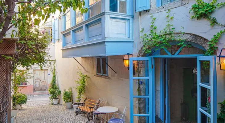 “Stone floors, fireplaces, rich fabrics, and traditional furnishings reflect the good taste that pervades these two photogenic, 150-year-old Greek houses on an atmospheric old backstreet.”