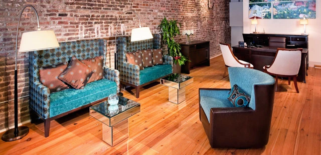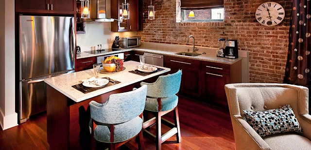"Exposed brick and original wood frame the otherwise contemporary decor throughout this boutique hotel featuring posh, fully furnished apartment-style suites replete with a full kitchen."