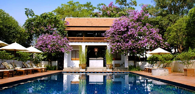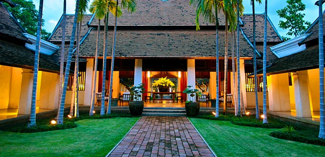 "Most of the rooms, all furnished with Lanna or Chinese antiques, are set along green lawns planted with tall palms and fragrant frangipani." Full review