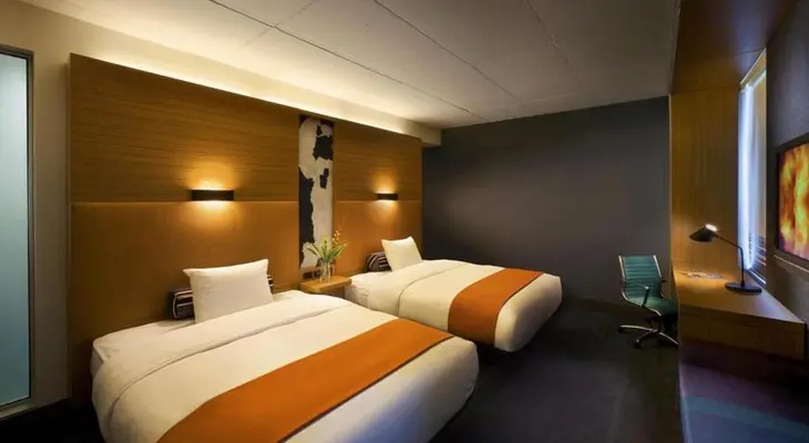 "It offers the chain’s usual petite, industrial-toned rooms and sociable, game-filled lobby. About 3.5 miles from the airport." Full review