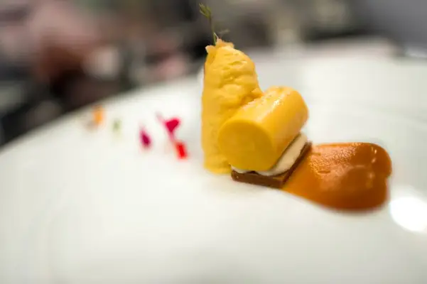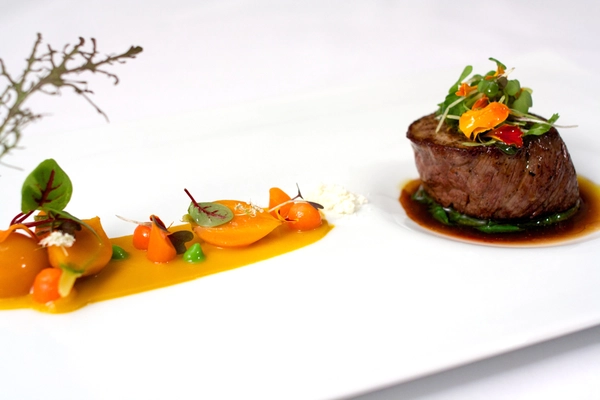 "Steak dishes are rarely visually arresting, but Nugent's consomme-poached filet is a revelation, surrounded by circles of carrot puree and bordelaise sauce." Full review