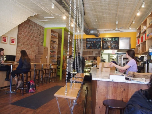 “Reenact your own grade-school days by having a cupcake at the swing-style chairs flanking the counter.”