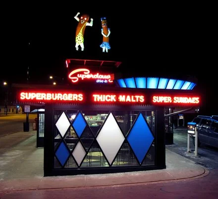 “Two 12-foot-tall hot dog icons blink to passersby from the roof of this legendary drive-in, which has been serving Superdawgs and Whoopercheesies (hot dogs and cheeseburgers, respectively) since 1948.”