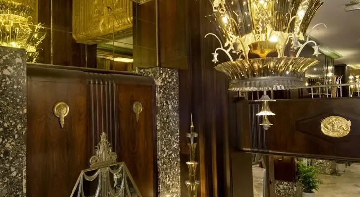 "The lobby looks like a Hollywood movie palace, with rosewood paneling and climbing-vine wall sconces in silver."