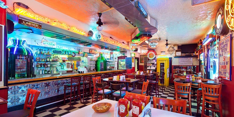 "Neon lighting (both exterior and interior) sets the tone at this quirky Linwood American known for jumbo burgers, chili and beer." Full review