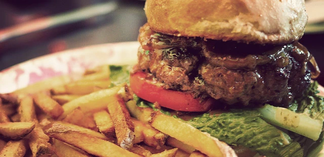 “Terry's Turf Club offers gourmet burgers that come on paper plates.”