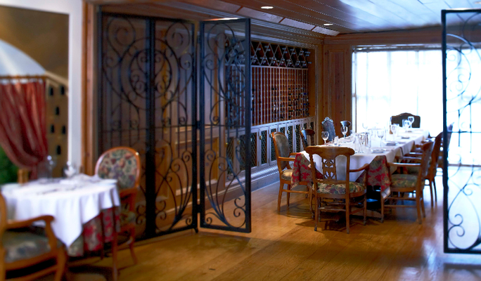 “This French countryside–style restaurant in the Renaissance Cleveland Hotel has bright murals on the walls and a massive stone hearth.”
