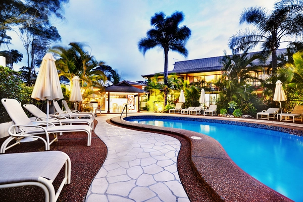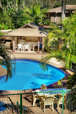 “Five minutes' drive north of Coffs Harbour's busy city center is this small resort with just 16 self-contained 1- to 3-bedroom apartments, some with hot tubs, spread out among tropical gardens.”