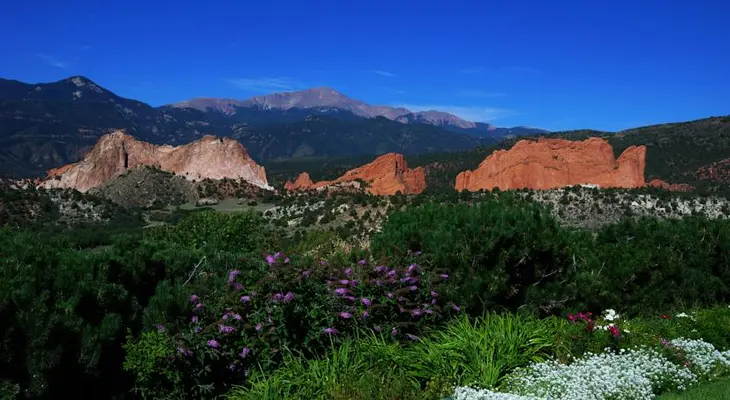 “Every room of this resort hotel perched atop a mesa faces west so you wake up to the sun blazing on the red rock sculptures of the Garden of the Gods and Pikes Peak towering above them.”