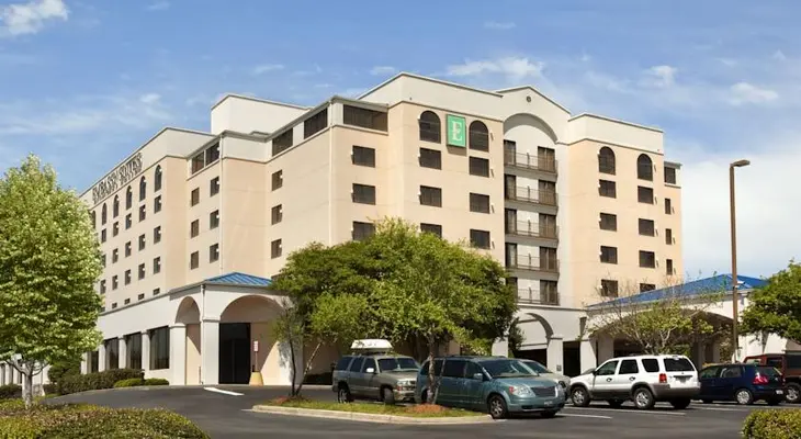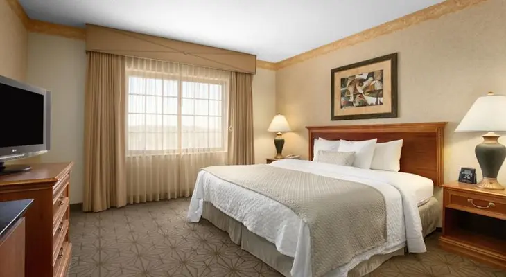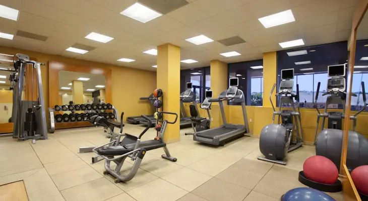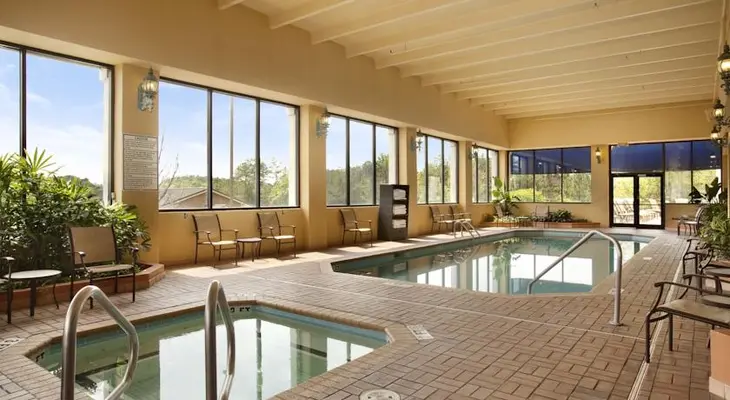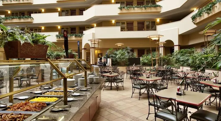 “In the spacious seven-story atrium lobby—with skylights, fountains, pool, and live plants—you can enjoy your breakfast and evening cocktails.”