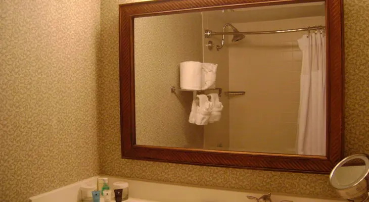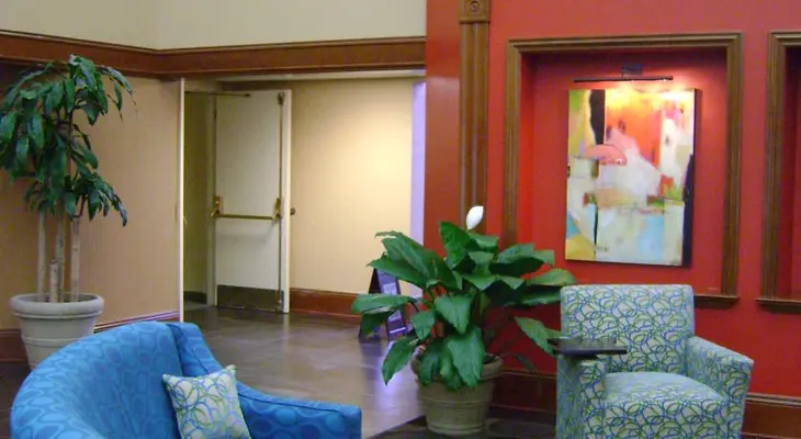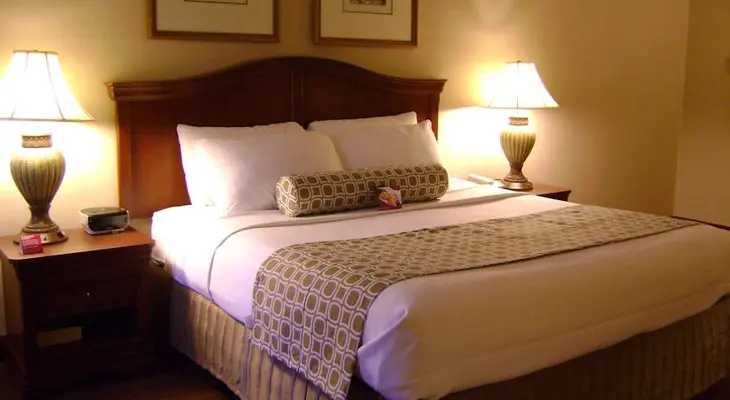 “Twenty-five minutes north of Downtown, in a serene business park with man-made lakes, this suburban-style three-story stucco lodge contrasts with the commercial blocks around it.”