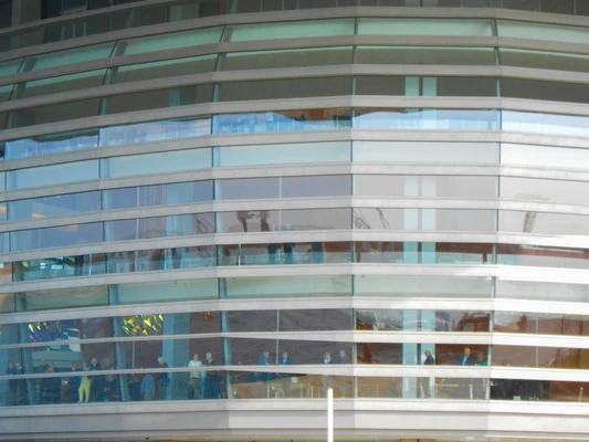 "A striated, bulgy glass module with a "floating" slab of a roof, asserts its presence on the harbor. The production calendar is equally aggressive."