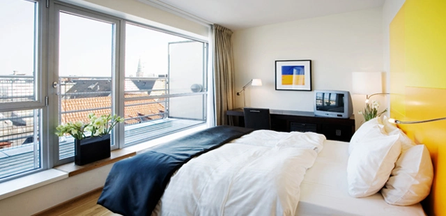 “Guest rooms, designed by Per Arnoldi, have a functional, modern aesthetic that's softened by bright, cheery colors. Many units have a terrace or balcony.”