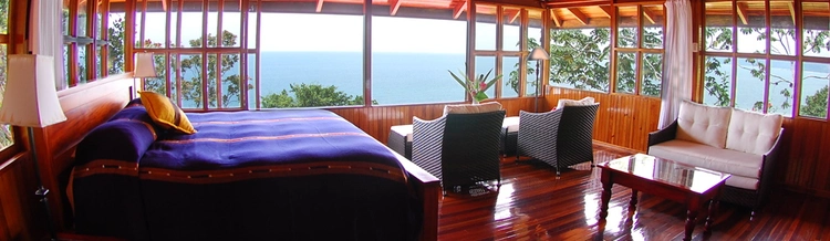 "The Lodge overlooks the Pacific on 14 acres backed by tropical jungle just a short walk to secluded black-sand beaches"