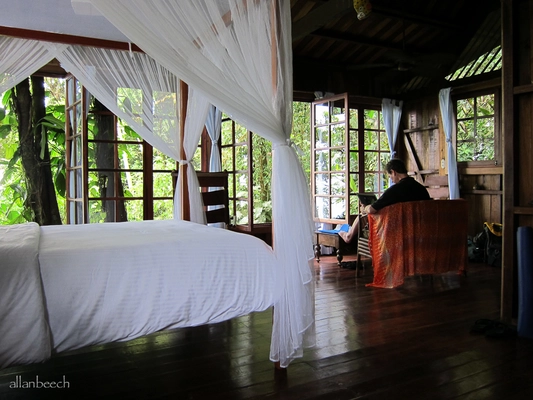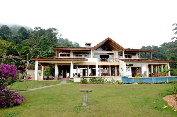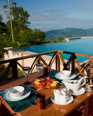“Hidden away in a spectacular mountain valley, this luxury eco-lodge has the best of everything: a huge stone fireplace inside and an infinity pool outside with distant ocean views.”