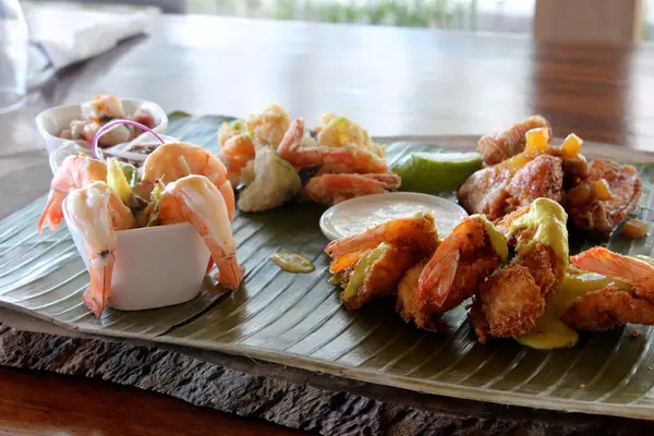 “Enjoy an alfresco seafood meal on the beach where the river meets the ocean.”